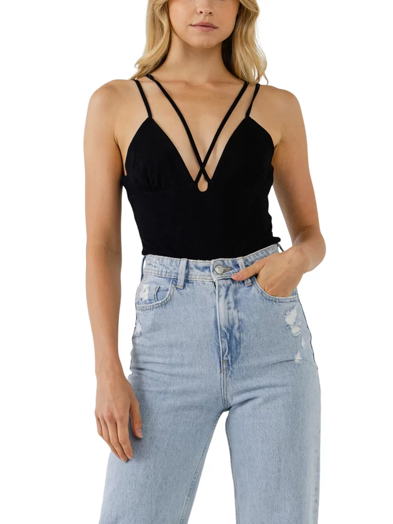 I am wearing a sexy, strappy black bodysuit.